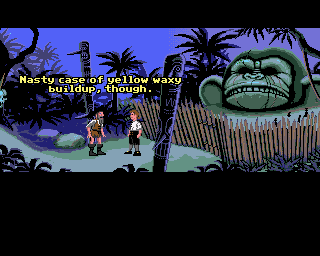 Cztery dyskietki prócz świetnej zabawy i zajebistej (wówczas) grafiki zawierały nieprawdopodobne zasoby odkrywanego stopniowo kryptycznego humoru. Małpią Wyspę kończyłem 3 razy za każdym razem łapiąc nowe nawiązania. Jest ich od groma, i pewnie jedynym sposobem by poznać wszystkie to wizyta na jednym z fanowskich małpich sajtów. Przykładem może być scenka, przez którą ktoś pewnie dostał zawału, kiedy nasz bohater – tak po prostu – runął ze skały a na ekran wyskoczyło okienko Restore, Restart or Quit the game. Na szczęście, chwile później Guybrush powraca otrzepując ciuchy i komentując na luzie: gumowe drzewa. Dodajmy, że okienko celowo zerżnięto z przygodówek Sierry.