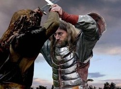 Oczywiście, jak to w takich historiach bywa, lepiej zbyt uważnie ich nie zgłębiać, bo zaczynają wychodzić na wierzch niedociągnięcia logiczne scenariusza. Np. szwarccharakter Ludojad, wycina w pień całą wioskę i ród Szarych Psów, ale… nie pozwala zabić chłopca (naszego herosa) by sprzedać go w niewolę do kopalni – choć przecież dużo lepszą cenę uzyskałby z dorosłych niewolników niż ze słabego smarkacza… że już o pannach do burdeli nie wspomnę. Tak więc, jak już oglądać, to raczej bezmyślnie…