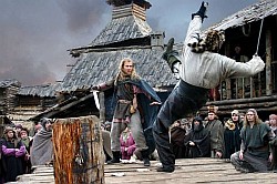 A teraz to, co odróżnia rosyjską produkcję od pierwowzorów. Najpierw scenografia i kostiumy. Wprawdzie krajobrazowo jest to nadal kopia innych filmów „góry, lasy, jeziora” ale już architektonicznie zupełnie coś innego. Wioski są drewniane, kryte strzechami, grody (tak, właśnie nie miasta ale grody) również drewniane, otoczone ostrokołem, z uliczkami pełnymi kałuż i błota. Wyglądają tak, jak wyobrażamy sobie dawne, pogańskie osady plemienne i słowiańskie grody.