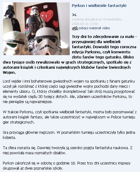 W zeszły weekend miał w Poznaniu miejsce konwent Pyrkon 2008. To wszyscy wiedzą, jednak dzięki niezawodnym mediom lokalnym mogą dowiedzieć się jeszcze więcej.