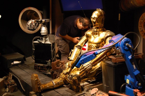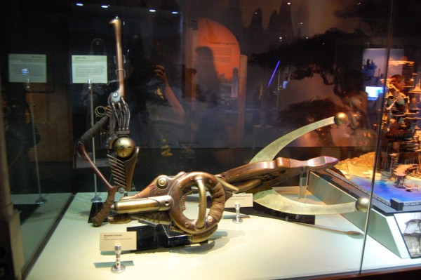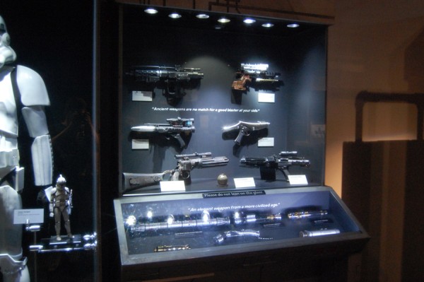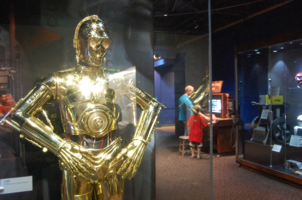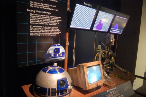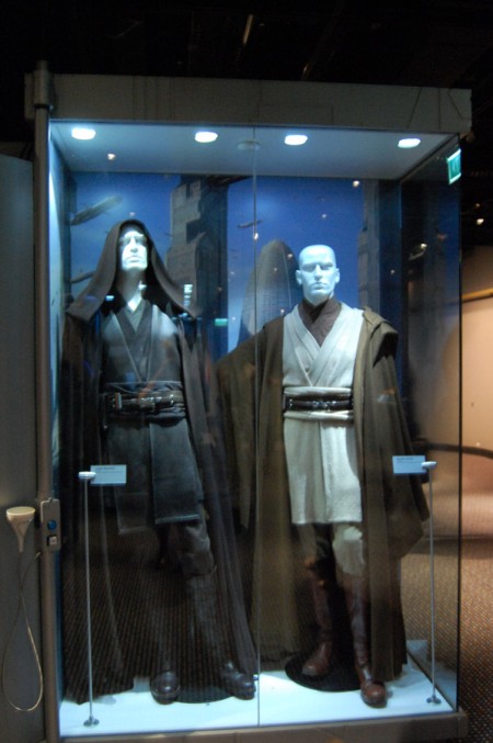 Była oczywiście też wystawiona różnoraka broń i odzież. Manekiny prezentowały oryginalne stroje z wszystkich części gwiezdnej epopei, były zatem stroje rycerzy Jedi Amidali, Hana Solo, Lei, Vadera, szturmowca, kostium Chewiego. I znów dla ciekawskich stanowiska do programowania małych robotów „Programming – Mobility – How To Do – Try This – What To Do” z R2-D2 i C- 3PO wystawionymi na czele. Wśród robotów nie zabrakło specjalnego show, który prezentował ich możliwości i porównywał świat rzeczywisty z fantazją. Całość była jakby konwersacją prowadzoną przez wirtualną postać wyświetlaną na ekranie, a siedzącym w niewygodnej pozycji C-3PO. Na ekranie pojawiały się fragmenty filmów i dokonania współczesnych konstruktorów. Pokaz nie zachwycał i – co tu dużo mówić – nie skłaniał publiczności do bicia gromkich braw.