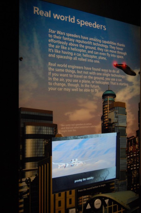 Landspeederowi Skywalkera towarzyszył stand z wbudowanym monitorem i szczegółowym opisem Real World Speeders, obok znajdowały się modele takich maszyn. Dla młodych adeptów walk i zdobywania przestworzy były gotowe stanowiska do prób z różnego rodzaju zdobyczami techniki, np. Build A Floating Car, Magnetic Leviation, gdzie można było wypróbować siłę magnesów. Nie zabrakło Hoth i modeli Tautauna, manekina Wampy, zbroi snowtroopera, jak i oprzyrządowania dzielnych rebeliantów. Gdy komuś zabrakło ciepła mógł obejrzeć się za siebie i wpaść na Tatooine gdzie w stylizowanych na skałę pulpitach można było odkryć tajemnice pustynnej planety wraz z kostiumami Ludzi Pustyni i Jawów z sandcrawlerem w tle. Nie mogło zabraknąć na wystawie Wookieech i ich wioski, stanowisk nad brzegiem wielkiej wody rodzimej planety Kashyyyk.