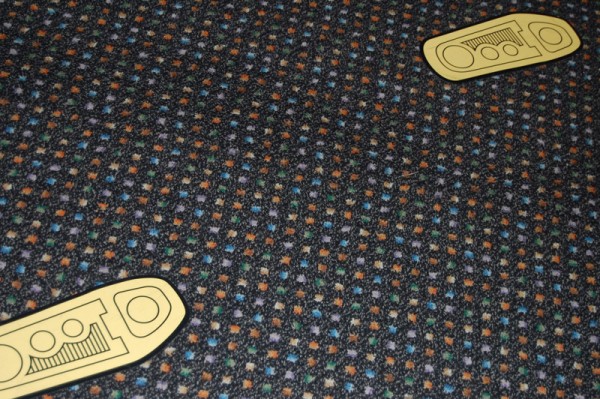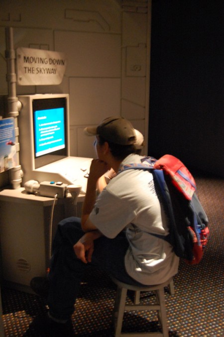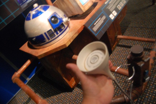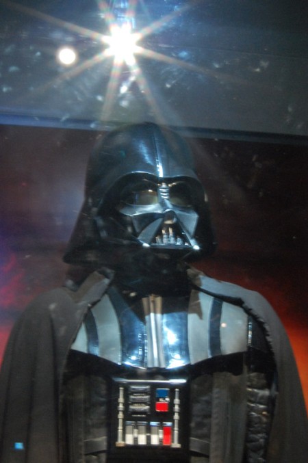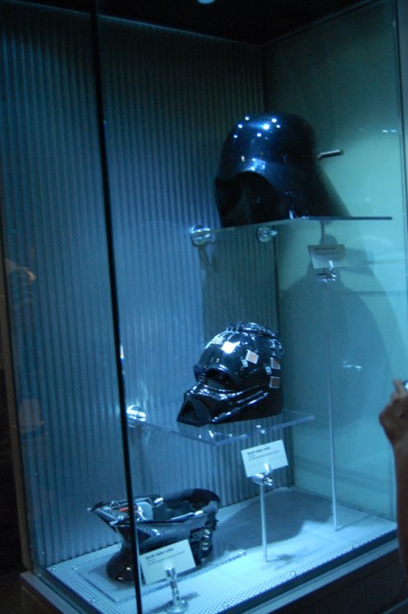 Po przekroczeniu bram w hallu kupuję bilety przy jakże znajomej statuetce R2-D2. Pani w okienku informuje że zdjęcia można robić bez używania lampy błyskowej – szkoda, bo co by nie mówić, całość zatopiona była w ciemnościach Sith:) Po kilku chwilach w ogromnym muzeum można było znaleźć drogowskazy do świata Gwiezdnych wojen (ślady stóp C-3PO na wykładzinie).