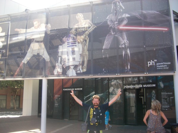 Na wystawę trafiłem podczas mojej podróży po Australii. Styczeń to wyjątkowo gorący miesiąc, 37-43 stopnie w słońcu, a temperatura dodatkowo zwiększała się przy kolejnym zbliżaniu do muzeum Powerhouse. Na drodze plakaty, miejska kolejka oblepiona reklamami, a już nad wejściem spory transparent Star Wars – trudno, żeby serce fana nie biło w tym momencie mocniej.
