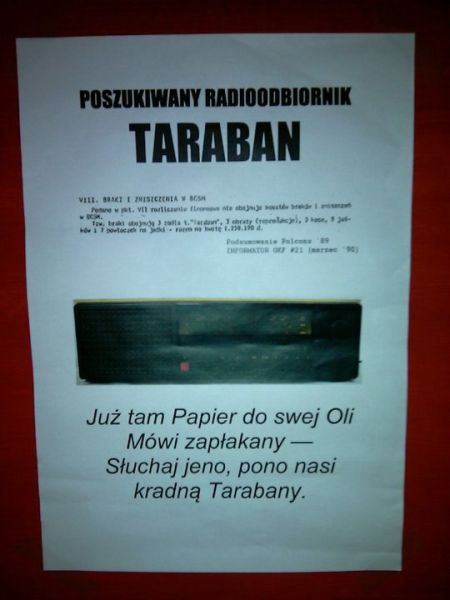 Rok ’89 długo będzie pamiętany przez fandom – zuchwała kradzież na połączonym z Polconem Nordconie wstrząsnęła wszystkimi. Zaginęły: pościel, reprodukcje obrazów oraz aż trzy bezcenne radia Taraban. Po wielu latach, z naszą niewielką pomocą, jeden z radioodbiorników odnalazł się. Winna zuchwałej kradzieży zostanie przykładnie ukarana, wyrok opiewa na dożywotnią koordynację Nordconów.