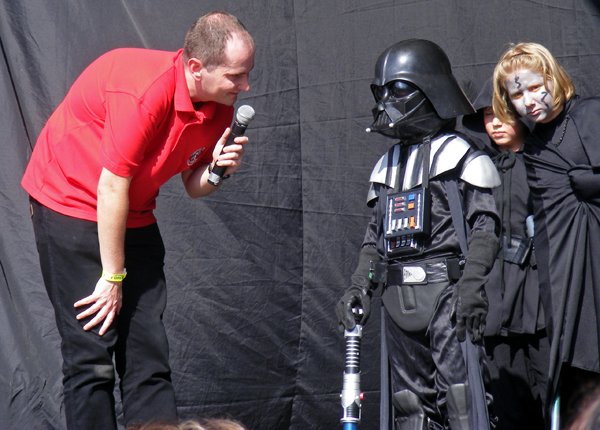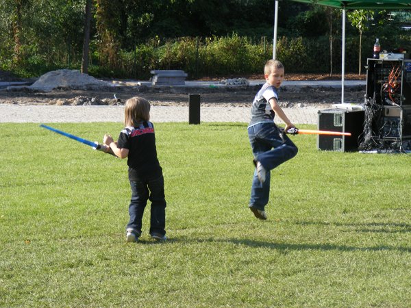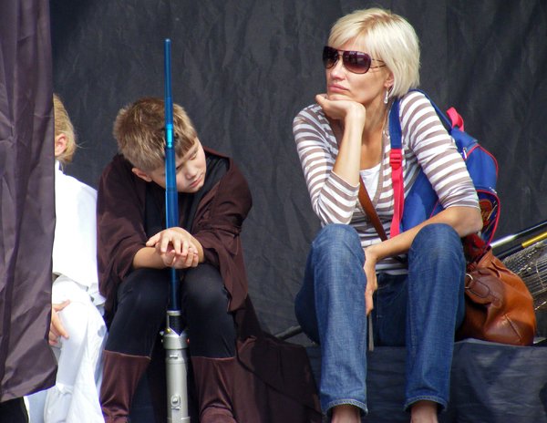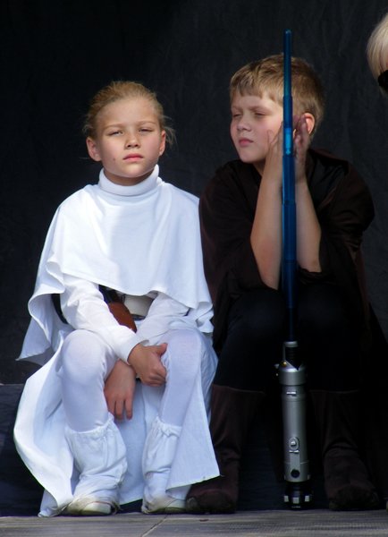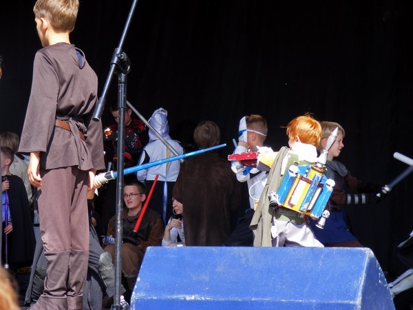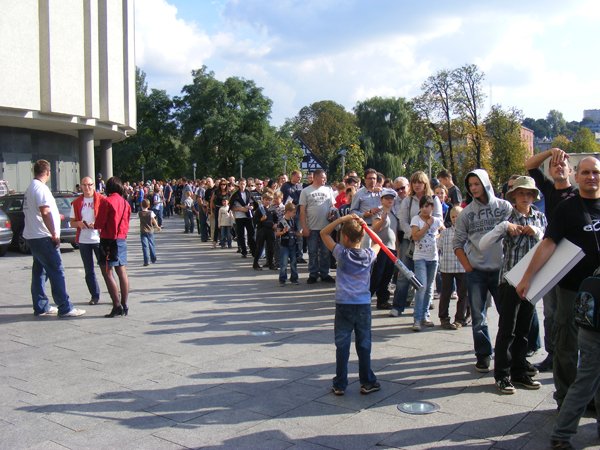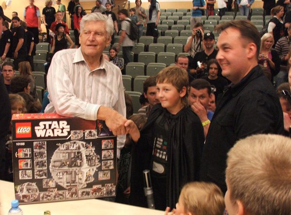 10. Oficjalny program kończy spotkanie z DP, do tego czasu kolejka umiera, za to przepełnia się sala konferencyjna, ponoć już nie wpuszczają, ale wchodzimy. Spotkania z SW-dziadkami sprowadzają się zwykle do pytań z sali, pytania zwykle nie są zbyt lotne („Czy Vader pokona Maula?”), również odpowiedzi rzadko bywają odkrywcze. To spotkanie od normy nie odbiega. Wpadamy na pomysł stworzenia emulatora takich spotkań, nie powinno być trudno.