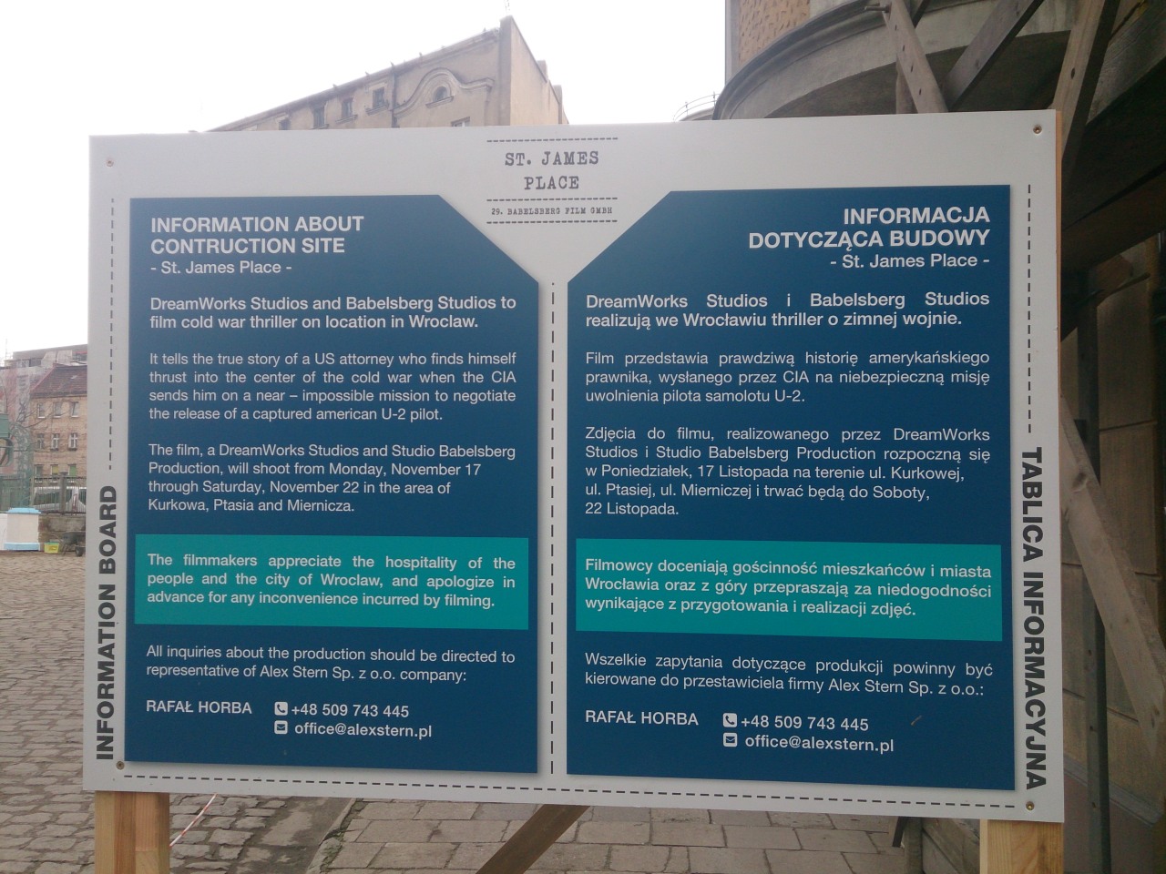 Pewnie wszyscy już wiedzą, że Spielberg kręci film we Wrocku. Obraz pt. St. James Place jest szpiegowski i opowiada o odzyskaniu przez USA pilota U-2 zestrzelonego w 1960 nad Sojuzem. Gra jak zwykle Tom Hanks, a także Mark Rylance, Amy Ryan, Alan Alda i Eve Hewson. Scenariusz napisał Matt Charman oraz bracia Coen. Film jest kręcony głównie w USA, UK i Niemczech, we Wrocławiu zrealizują tylko kilka scen.